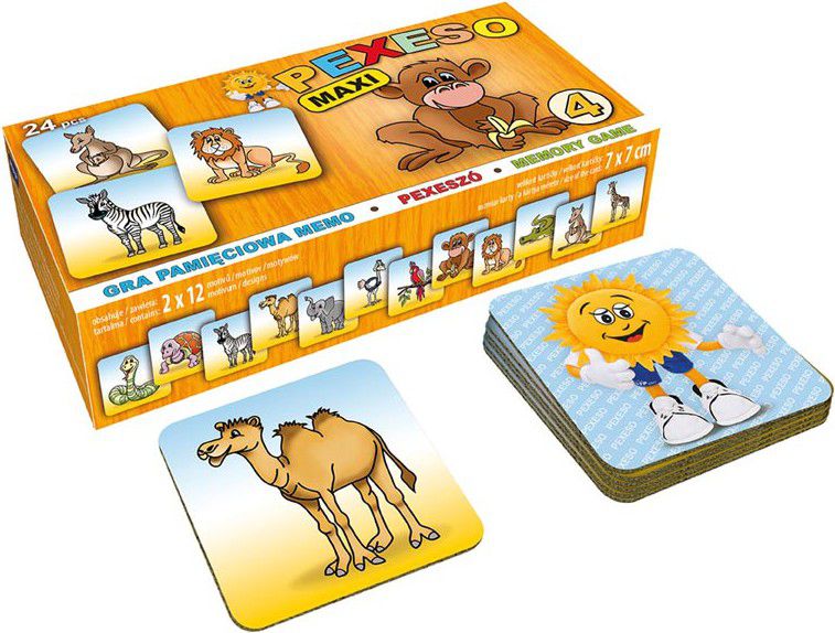 - Pexeso se skládá z 24 vyseklých kartiček pexesa (had, želva, zebra, velbloud, slon, pštros, papoušek, opice, lev, krokodýl, klokan, žirafa). Tloušťka kartonu je 3 mm, aby jej malé děti mohly lépe uchopit a otočit.