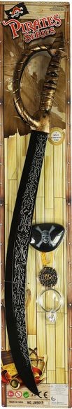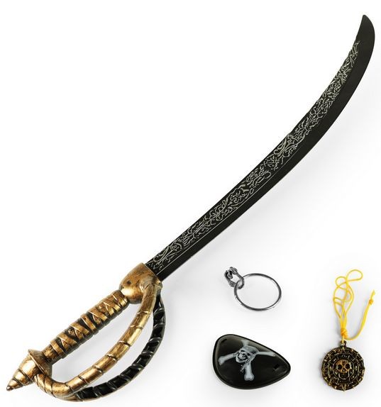 - Balení obsahuje: vzorovaný meč s úchvatnou rukojetí, pirátskou klapku na oči, náhrdelník s motivem lebky a stříbrný kroužek do ucha.