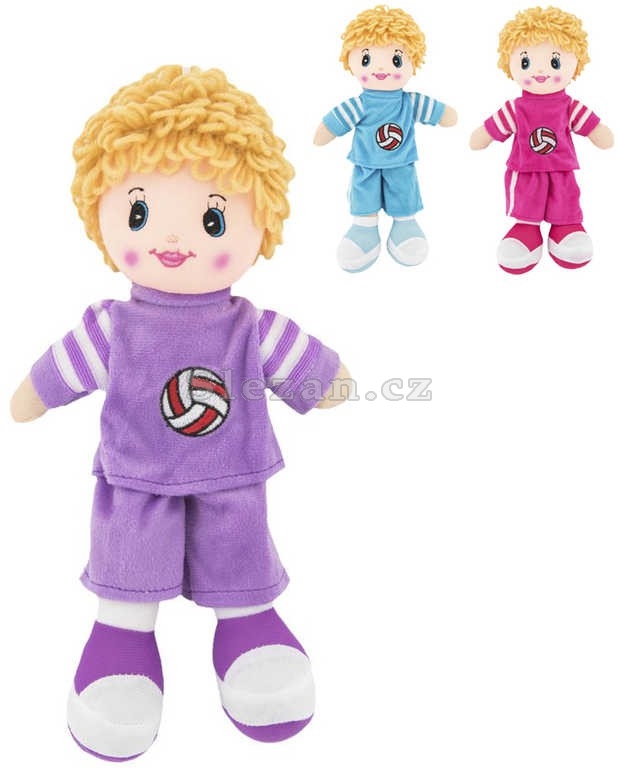 Kvalitní textilní panák chlapeček s kudrnatými vlásky, v oblečku s motivem míče, ve třech barevných variantách.