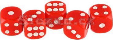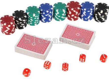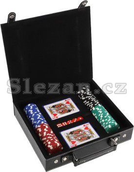 Kufřík obsahuje 100 ks žetonů, 2 balíčky karet a 5 kostek.