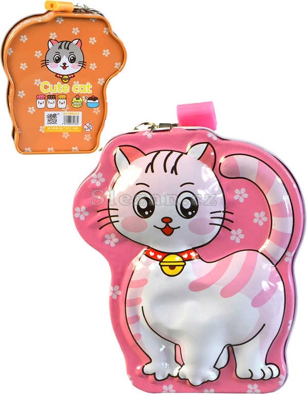 Originální plechová reliéfní pokladnička ve tvaru kočičky, ve čtyřech barevných variantách, s uzamykáním na zámek, pro všechny malé šetřílky.