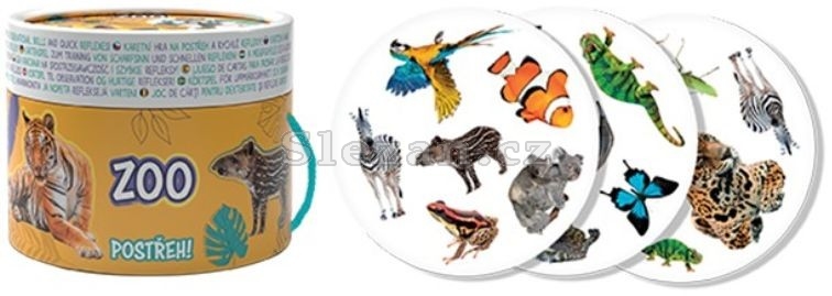 Karetní hra na postřeh a rychlé reflexy obsahuje 30 barevných kartiček ke hraní v tubě s oblíbeným motivem zoo a seznamem všech zvířat.
