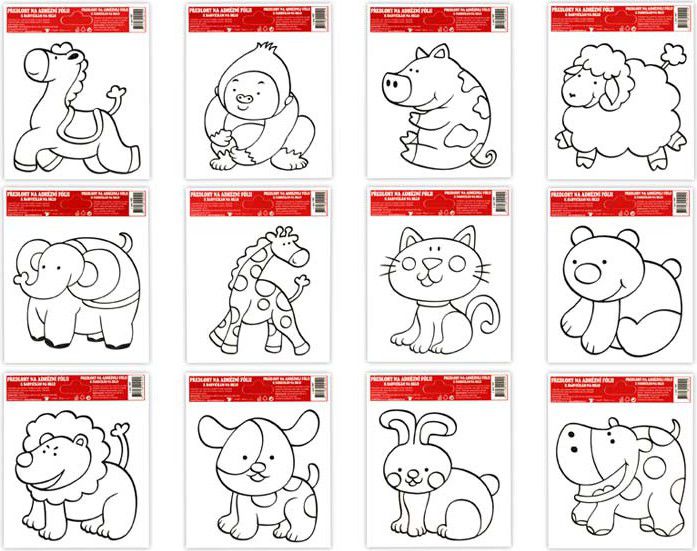 Předloha k barvičkám na sklo na adhezní fólii - Udělejte si pohodové odpoledne s dětmi, překreslete si obrázek pomocí těchto šablon, který si pak můžete umístit na Vaše okno. Provedení: různá zvířátka - koník, lev,opice, kočka, prasátko, žirafa, slon, medvěd, pes, zajíc, hroch, ovce NÁVOD: Vybarvěte a po uschnutí umístěte na čisté, případně navlhčené sklo, nebo jinou čistou a hladkou plochu. Obrázek elektrostaticky přilne. Můžete vybarvit barvičkami na sklo, fixami, vodovými barvami apod. Uvedená cena je za 1 ks.