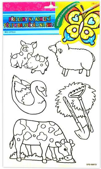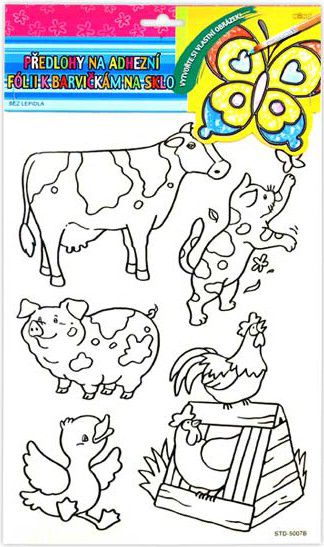 Předloha k barvičkám na sklo na adhezní fólii - Udělejte si pohodové odpoledne s dětmi, překreslete si obrázek pomocí těchto šablon, který si pak můžete umístit na Vaše okno. Provedení: domácí zvířátka - kůň, kohout, pes, ovečka, husa, kuřátko, prasátko, kráva, kočka, aj. NÁVOD: Vybarvěte a po uschnutí umístěte na čisté, případně navlhčené sklo, nebo jinou čistou a hladkou plochu. Obrázek elektrostaticky přilne. Můžete vybarvit barvičkami na sklo, fixami, vodovými barvami apod. Uvedená cena je za 1 ks.