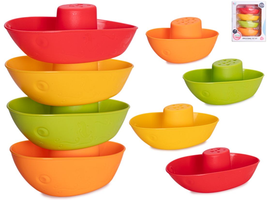 Pyramida z barevných lodiček rozvíjí jemnou motoriku dítěte.