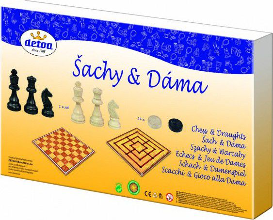 Šachové figurky (rozměr krále je 30x74 mm) a dámové kameny (? 30 mm) jsou dřevěné a oboustranný herní plán o rozměrech 330x330 mm je z tvrdého kartonu.