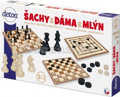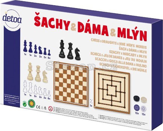 Set obsahuje tři oblíbené deskové hry: šachy, dáma, mlýn.