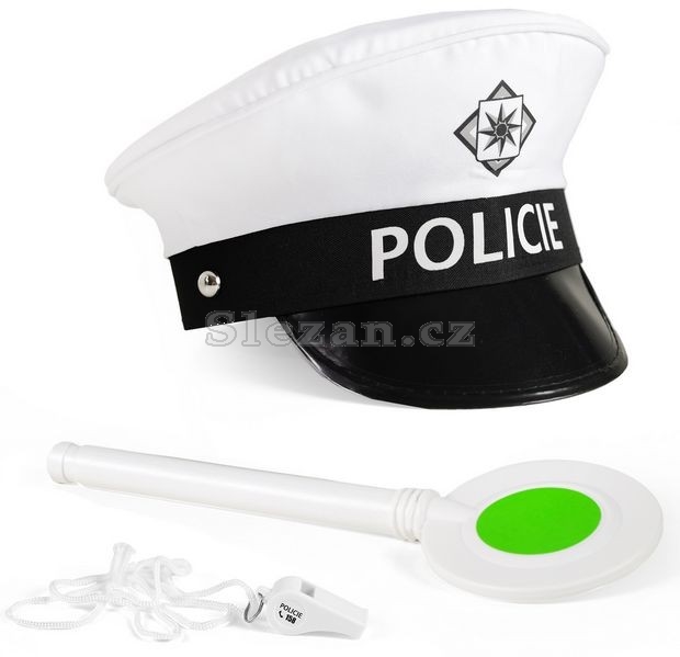 Sada obsahuje bílou dopravní policejní čepici s nápisem, terčík a píšťalku.