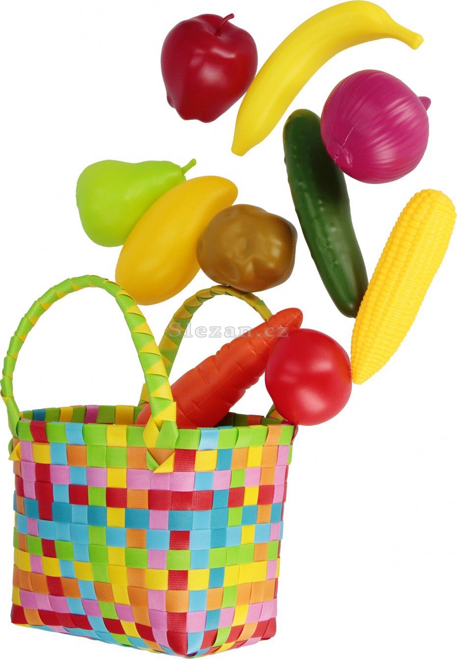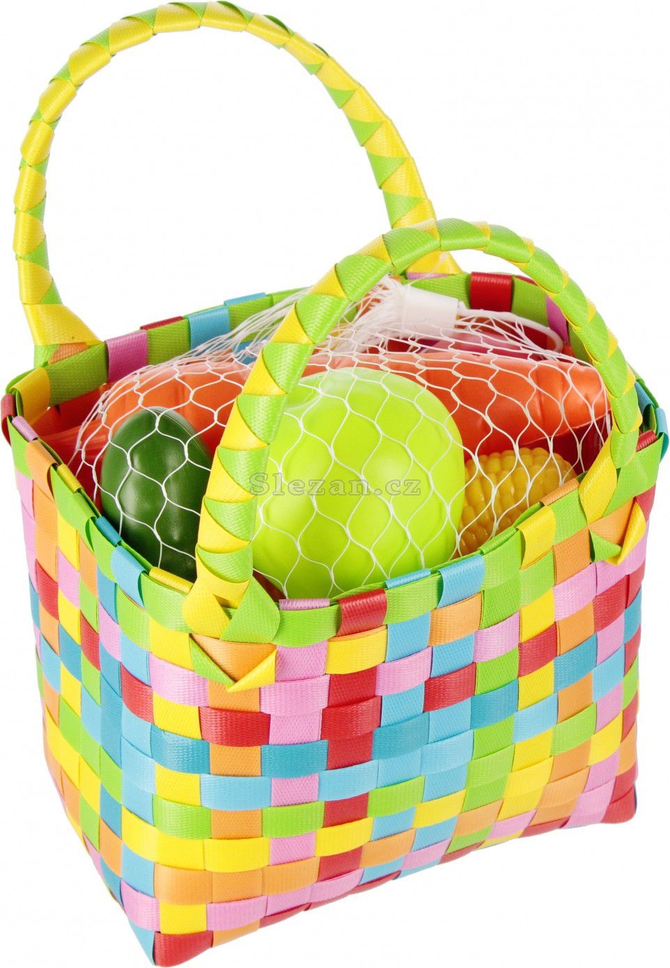 Obsah sady: barevný tkaný košík, kukuřice, česnek, jablko, hruška, mrkev, brambory, rajče.