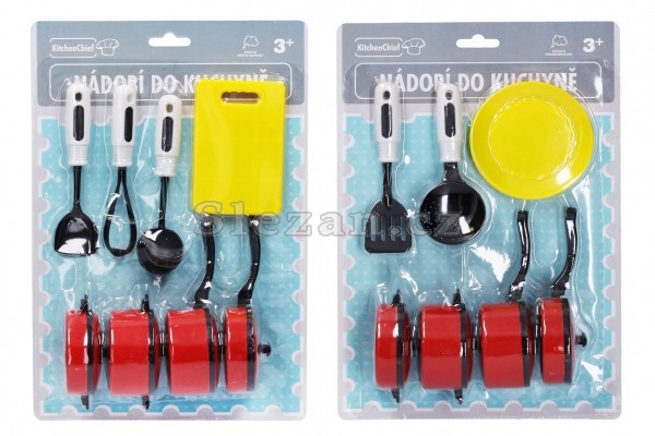 V této sadě z kvalitního plastu jsou dva hrnce, dvě pánvičky, talíř a dvě náčiní.