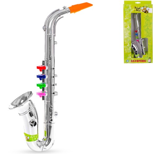 Krásný, lesklý, stříbrný saxofon pro děti a všechny malé muzikanty.