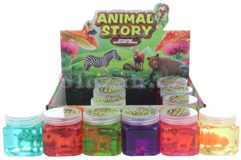 Barevná slizová hmota s plastovým zvířátkem uvnitř.