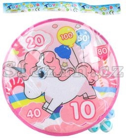 Růžový textilní terč s motivem jednorožce, na zavěšení, se šesti lehkými pěnovými míčky na suchý zip.