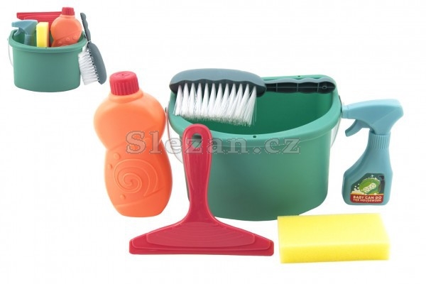Aby maminka nebyla na uklízení sama, máme zde pomůcky pro malé pomocnice – smetáček, čistící prostředky, stěrku, houbičku, kyblík