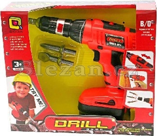 Funkční aku vrtačka z plastu v červené barvě, v sadě se dvěma náhradními vrtáky, pro všechny malé kutily a pomocníky v domácnosti. Baleno v krabici.