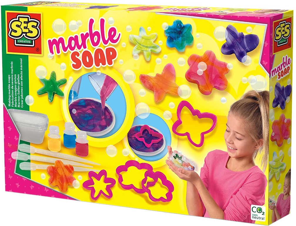 S přiloženým základem mýdla, kosmetickými barvami a tvořítky si můžete vytvořit ty nejkrásnější a úžasně voňavá mýdla ve tvaru květin a motýlů.