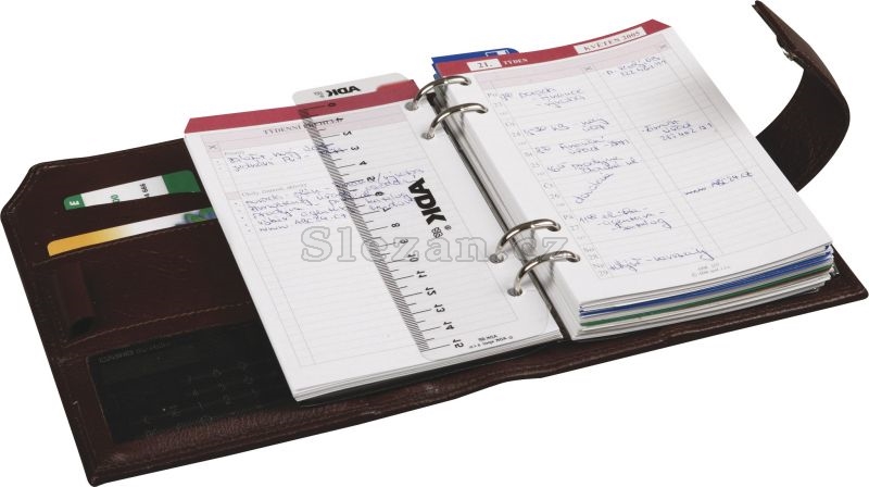 Formát desek A6, 19x15cm. Velikost formulářů 16x10,5cm. Elegantní a praktické desky v moderním designovém pojetí šité mírně kontrastním stehem, vyrobené z měkké a na omak příjemné kůže zpracované do nejmenších detailů. Kůže v hnědé nebo černé barvě. Nejprodávanější manažerský standard formátu A6. Obsahuje manuál ADK, kuličkové pero ADK, šanon na formuláře, dělící listy se symboly, dělící listy s čísly modré, dělící listy s čísly hnědé, obal na vizitky, universální obal, pravítko ADK, diář, A-Z adresář, plánovací kalendář, týdenní plán- pravý, roční plán, nezapomeň, týdenní rozvrh, aktivity, projekt, finance, pravidelné platby, klíčové oblasti, sebeřízení, telefonní seznam, kontakty, internetové adresy, infosada, chytrá desatera uživatele ADK, mapa ČR a Prahy, kilometrovník, poznámkové listy, záznam z jednání, myšlenkové mapy.