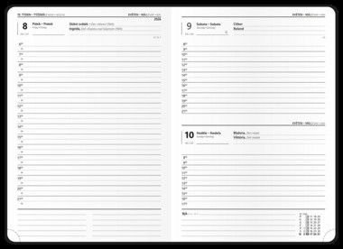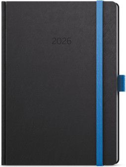 Neobyčejný denní diář s matným povrchem ze strukturovaného materiálu s modrou gumičkou a poutkem. Je vyráběný ve formátu A5, má velký prostor pro poznámky a plánování.