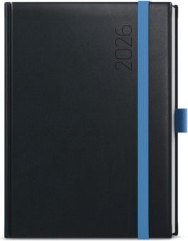 Denní diář v černé barvě z jemné vivelly ve formátu A5 s praktickou gumičkou a poutkem na propisku. Má velký prostor pro poznámky a plánování.