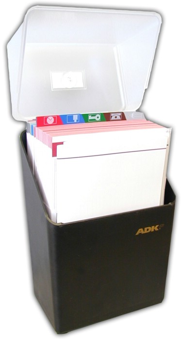 Kazeta s víkem obsahuje: Dělící listy se symboly, diář, A-Z adresář, plánovací kalendář, denní plány termínovaný, týdenní plány - levé, roční plán, aktivity, nezapomeň, týdenní rozvrh, roční rozvrh, projekt, finance, pravidelné platby, klíčové oblasti, telefonní seznam, kontakty, internetové adresy, poznámkové listy, záznam z jednání, záznam z porady, milimetrový papír, čtverečkovaný papír.