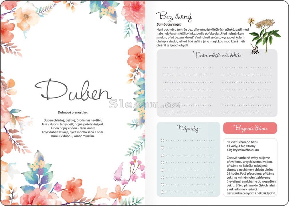 Elegantní barevný diář s popisem účinků a použití vybraných bylinek na každý měsíc, citátem na každý týden a prostorem pro poznámky, nápady a inspiraci.