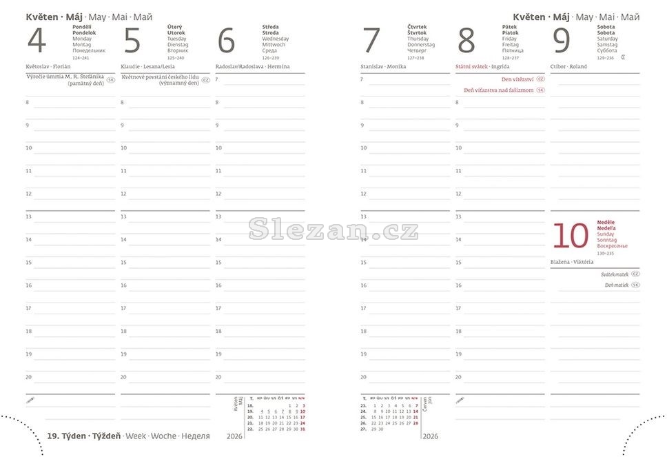 Diář obsahuje: osobní údaje, plánovač dovolené (měsíční přehled), plánovací kalendář, telefonní předvolby, státní svátky České a Slovenské republiky, mezinárodní svátky, roční výhled, týdenní layout, adresář, mapa Evropy a České a Slovenské republiky.