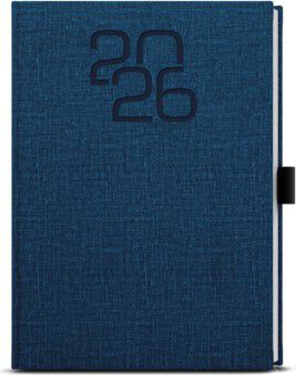 Týdenní diář modré barvy formátu A5 vyrobený ze zajímavého materiálu s moderní ražbou roku a poutkem na tužku.