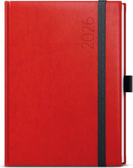 Týdenní diář v červené barvě z jemné vivelly ve formátu A5 s praktickou gumičkou a poutkem na propisku. Má velký prostor pro poznámky a plánování.