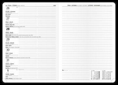 Diář s týdenním kalendáriem na jedné straně a na druhé straně s prostorem na poznámky. Desky jsou vyrobeny ze strukturovaného lesklého materiálu s jednostrannou pěnovou výplní a s kulatými rohy.