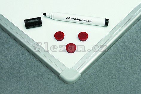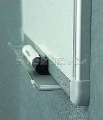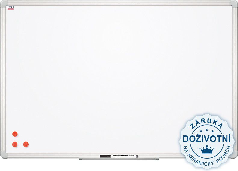 Magnetická bílá tabule s keramickým povrchem a hliníkovým rámem, popisovatelné za sucha stíratelnými popisovači, s odkládací lištou a sadou pro připevnění na zeď.
