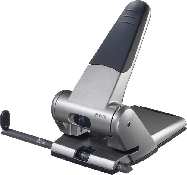 Vysoce výkonný děrovač s kapacitou děrování až 65 listů. Jedinečný elegantní design. Robustní, hliníkové součásti. Přehledný příložník pro nejrůznější formáty (A3, Folio, A4, US, A5, A6, 8x8x8). Zabudovaný přidržovač ramene umožňuje během nepoužívání děrovačku ukládat pro úsporu místa sklopenou (např. do zásuvky prac. stolu). Vyklápěcí dno pro pohodlné vyprazdňování odřezků. Stříbrná barva. Záruka 10 let.