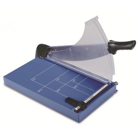 Výkonné pákové řezačky s kovovým stolem a plastovým ochranným krytem.