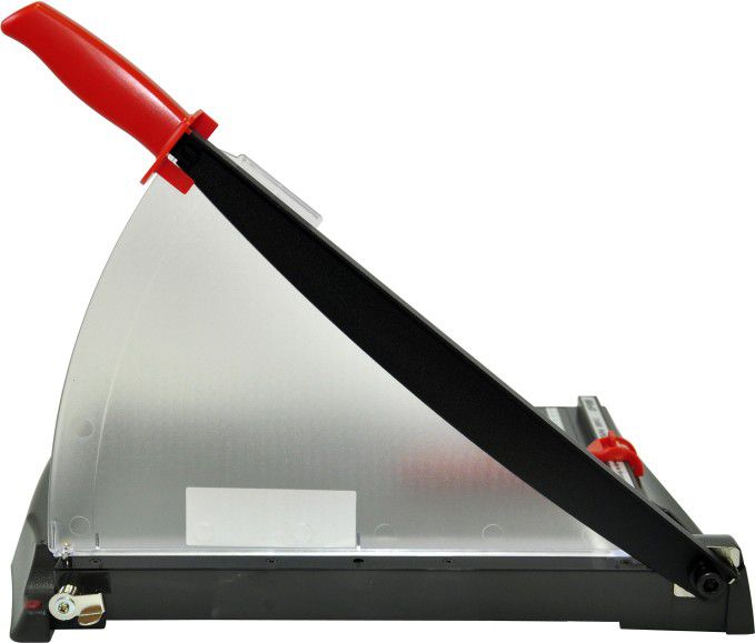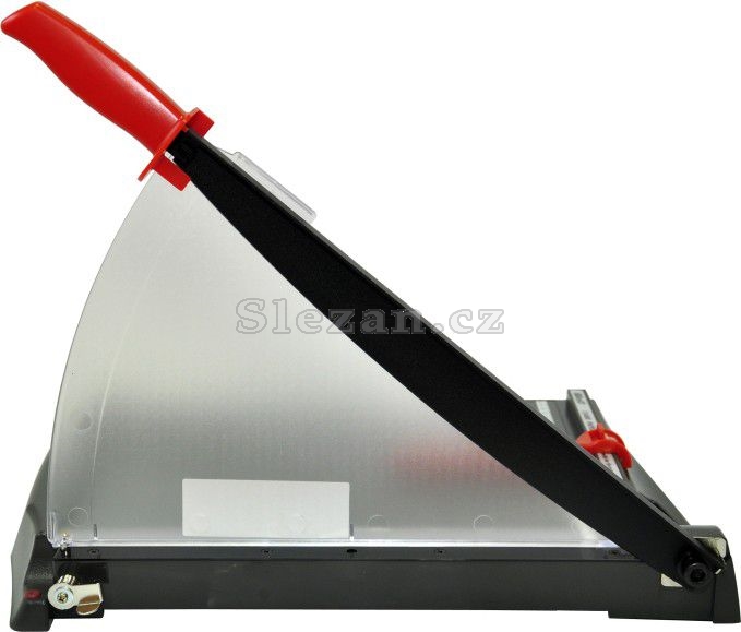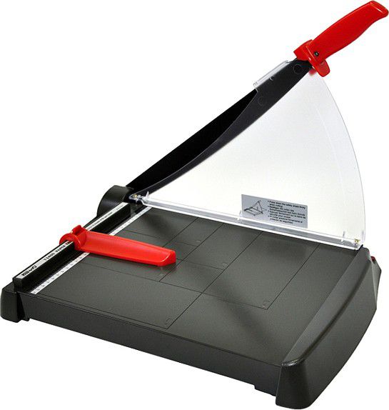 Hobby páková řezačka A4, s plastovým ochranným krytem a plastovým stolem, s vyznačenými měřítky a DIN formáty a posuvným dorazem papíru.
