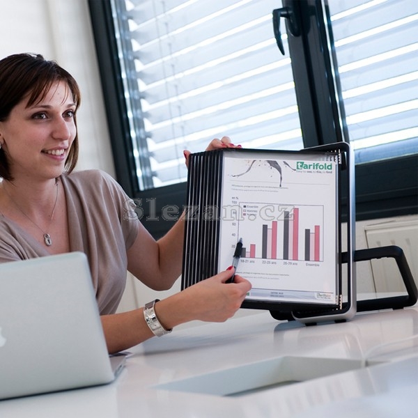 VEO pultový stojan s velmi stabilní kovovou konstrukcí v zajímavém minimalistickém designu. Jednoduché vložení a vyjmutí kapes pomocí úchytů. Dodáván včetně 10 černých kapes formátu A4. Kapsy s úchyty jsou vyrobeny z ekologicky šetrného polypropylenu. Rámeček je uvnitř vyztužen ocelovým drátem, kapsa je pružná a tvarově stabilní. Držák lze umístit na pulty, stoly reprezentativních míst. Podstavec vybaven protiskluzovými podložkami. Barva displeje i rámečků: černá. Unikátní balení v atraktivním archivačním boxu.