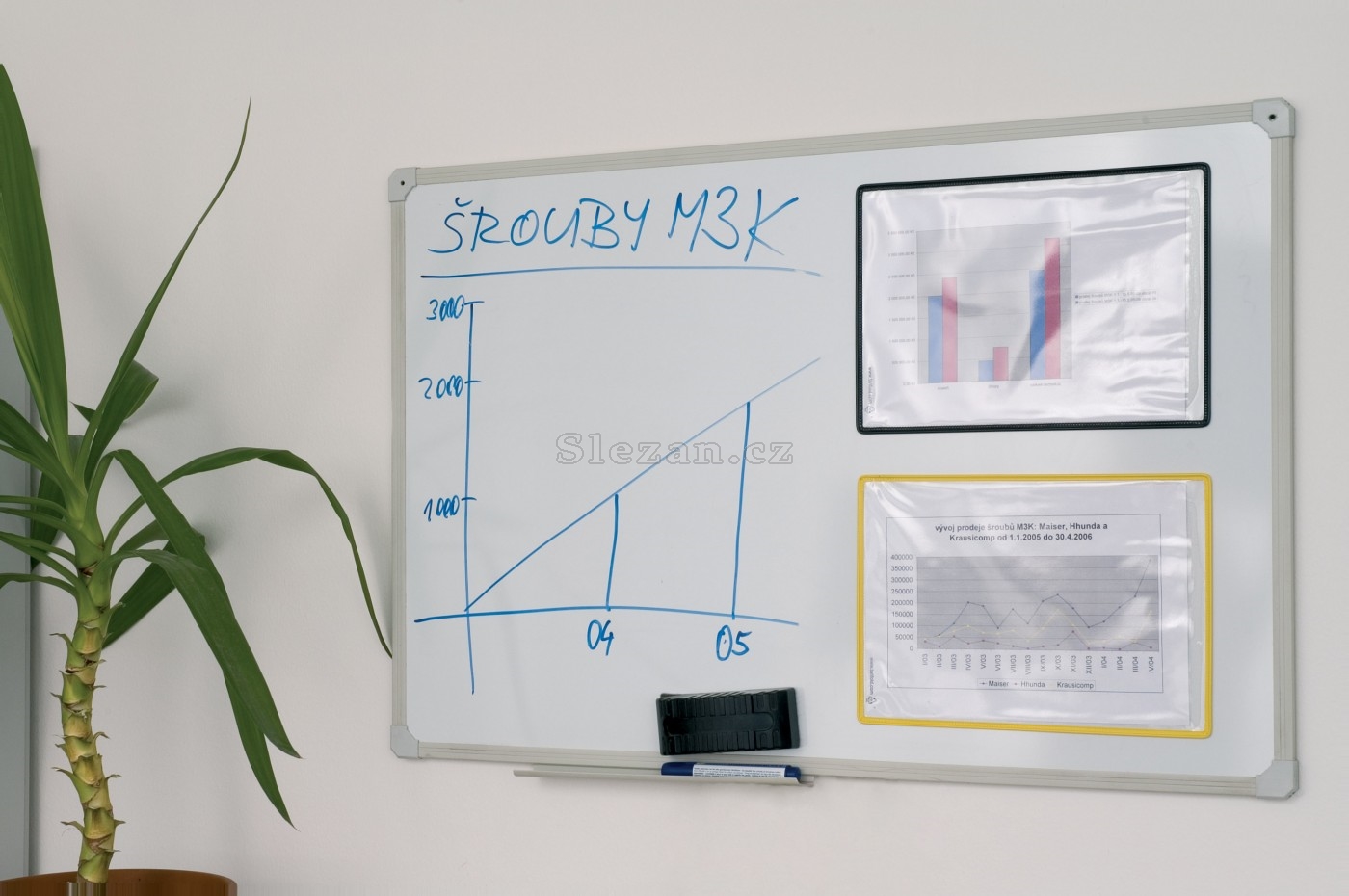 Snadné umístění informací díky samolepicím kapsám. S barevnou škálou rámečků ochranných kapes s nepermanentní zadní lepicí plochou jednoduše upevníte a přemístíte důležité pokyny, a to bez zanechání stop po lepidle. Tyto kapsy lze využít prakticky kdekoliv - kancelář, sklad, dílna, kde chcete uchránit důležité informace před prachem a vlhem. Standardní kapsa A4 je vyztužena ocelovým drátem, a tak si zachová stálý tvar i pružnost lemu. Kapsy jsou vyrobeny z antireflexního PVC pro optimální průhlednost, povrch se neleskne. K otevření na kratší straně. Barva lemu: modrá, červená, žlutá, zelená, černá. Balení: 5 kapes.