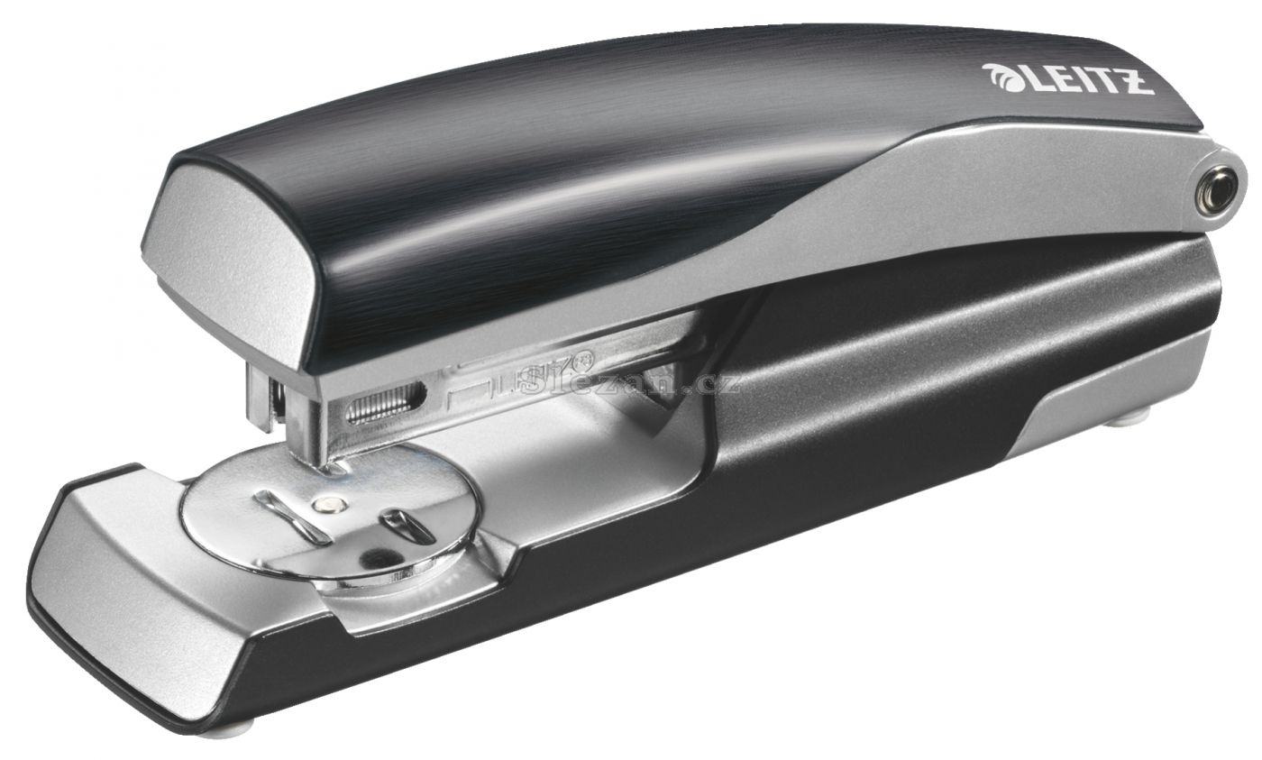 Pevná celokovová sešívačka. V barvách řady Leitz Style, povrch je v designu broušené oceli. Základna z kovu, rameno kov/plast. Protiskluzové plastové dno proti poškození nábytku.