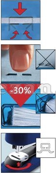 Sešívačka s plochým sešíváním. Délka ramene 6 cm. Sešívání až 50 listů. Spojovače 24/6 nebo 24/8. Ušetří až třetinu místa v pořadačích. Záruka 25 let. Barvy: černá, modrá, šedá.
