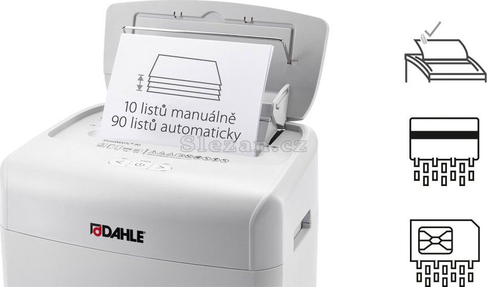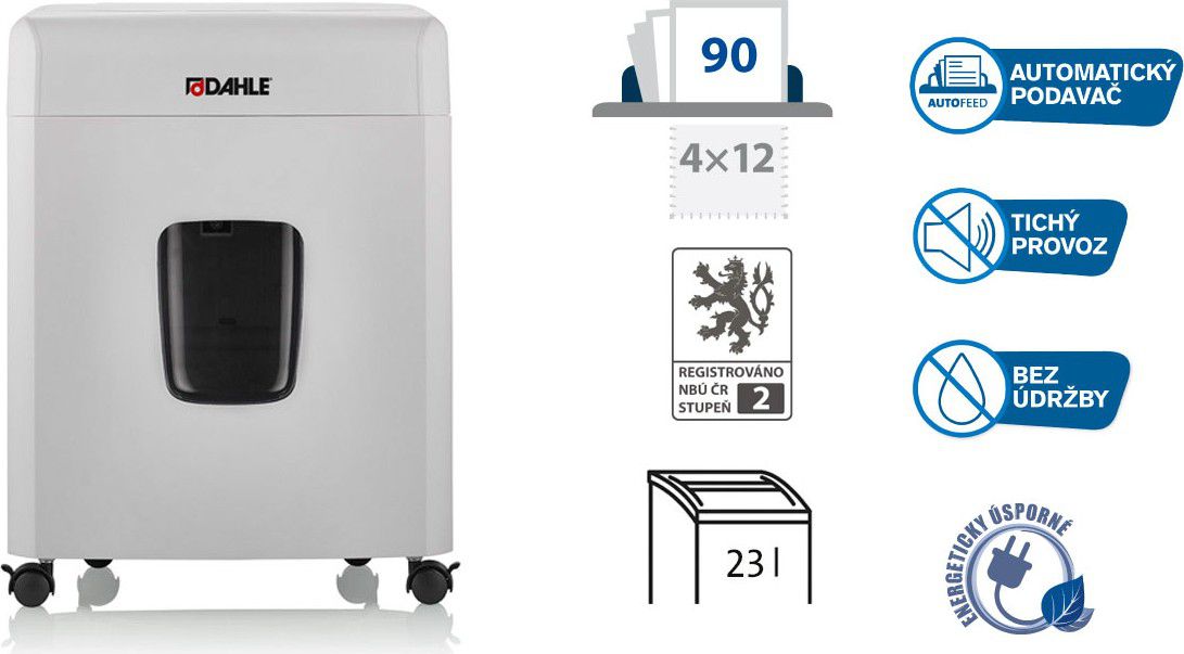 Výkonný skartovač s automatickým podavačem až na 90 listů vhodný pro menší pracovní skupiny šetří váš čas. Ideální pro skartaci dokumentů s důvěrnými informacemi - ceníky, faktury, evidence a osobní dokumenty. Skartuje papír včetně drátků ze sešívaček a likviduje bezpečně platební karty. Při použití automatického podavače stačí vložit papír a vše ostatní udělá skartovač sám. Indikace přetížení, přehřátí a plného koše. Bez nutnosti mazání a údržby.