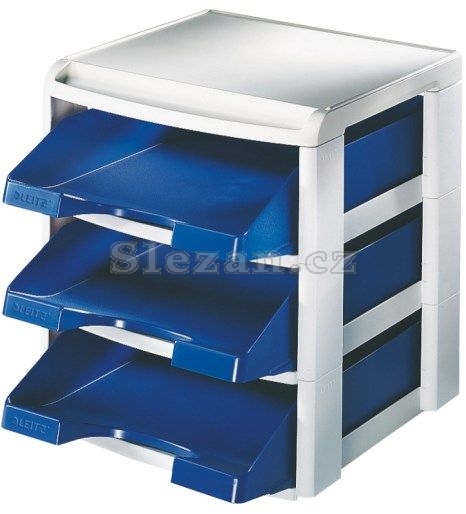 Stabilní stohovací systém je součástí řady plastových doplňků Leitz PLUS. Všechny jeho části jsou vyrobeny z pevného plastu. Skládá se ze 3 stohovacích modulů (poliček), 3 odkladačů Leitz PLUS a vrchního víka.