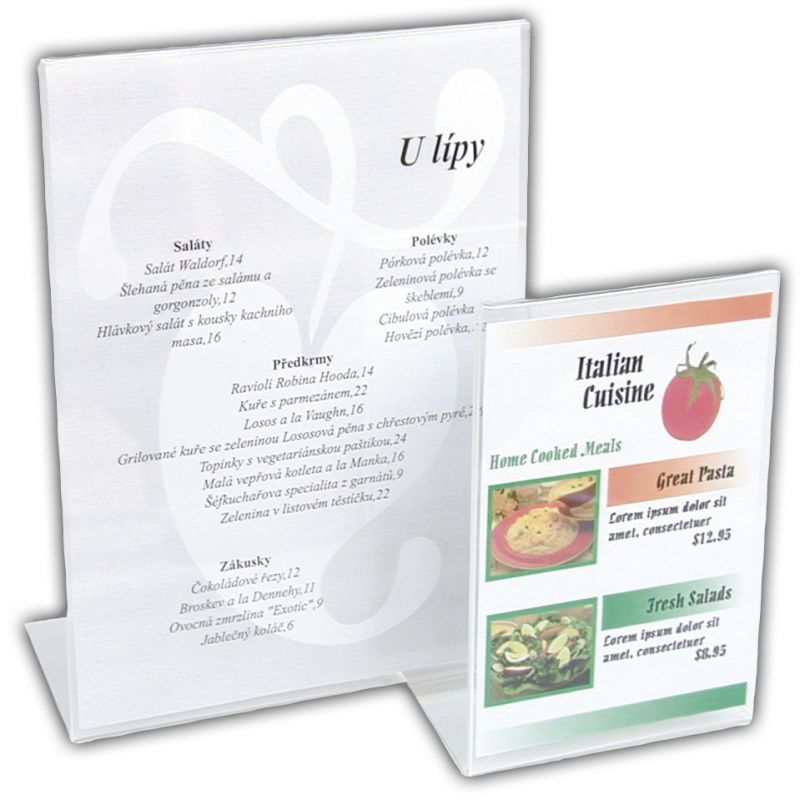 Jsou vyrobeny z čirého akrylátu tl. 2mm. Používají se tam, kde je nutno označit, zviditelnit a zvýraznit výrobek. Čitelné z přední strany.
