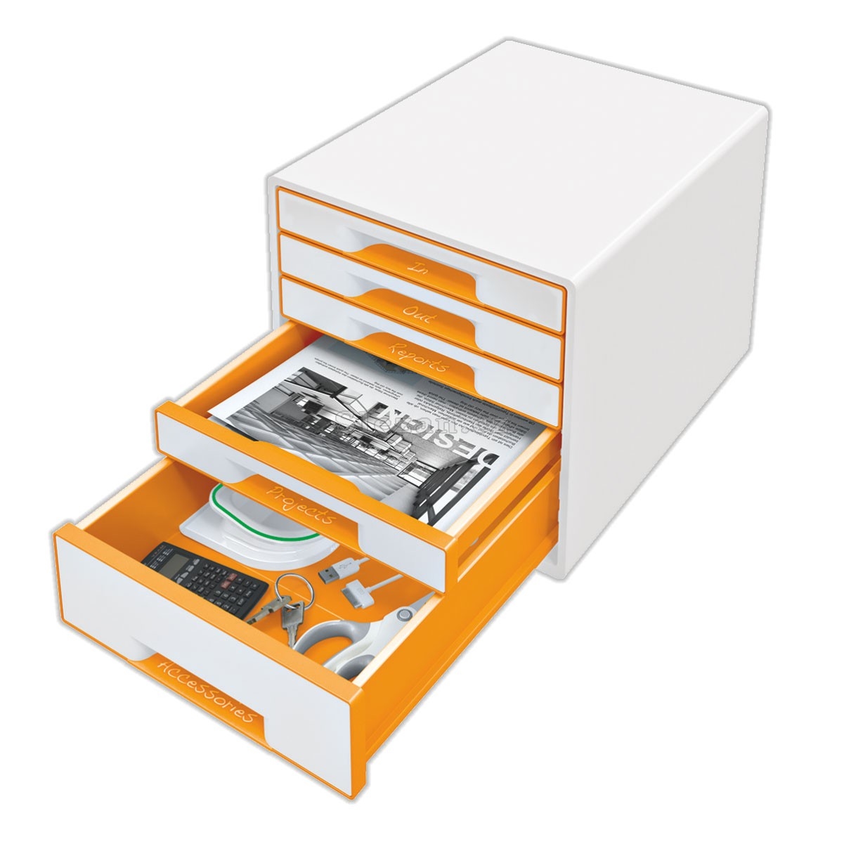 - 4 malé zásuvky pro ukládání kancelářských dokumentů a výrobků pro archivaci, jako jsou např. kapsy, pořadače, desky na spisy a 1 velký šuplík pro skladování dalších předmětů, např. sešívačky, mobilních zařízení atd.