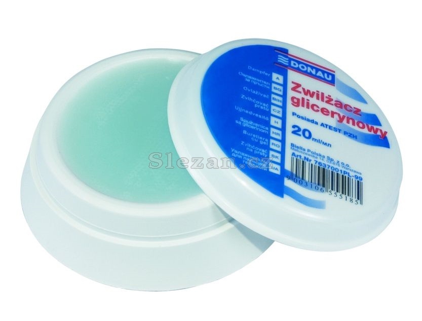 Glycerinový zvlhčovač prstů nezanechává mastné skvrny na papíře. Vyznačuje se jemnou vůní máty. Netoxické složení, na bázi glycerinu. Obal má protiskluzový povrch dna. Průměr podušky: 55 mm. Celkový průměr balení: 80 mm. Neobsahuje nebezpečné složky a gel není škodlivý. Objem: 20 ml.