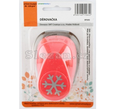 Děrovačka pro výtvarnou tvorbu. Postup: 1. pracujte s děrovačkou na pevné a rovné ploše. 2. vložte papír vhodné tloušťky - 90-220 g/m2 a zatlačte na páku statickým tlakem. Nikdy ne úderem na páku. 3. POUŽÍVEJTE POUZE NA PAPÍR. Děrovačky nikdy nepoužívejte na materiály potažené lepící vrstvou (například na samolepicí štítky), na pěnovku, na papírové ubrousky. Děrovačky nejsou vhodné pro děti do 3let.