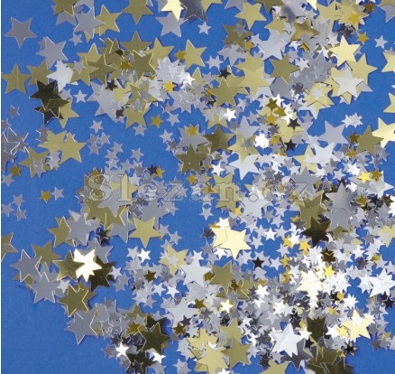 Flitry hvězdičky ve zlaté a stříbrné barvě v několika různých velikostech.