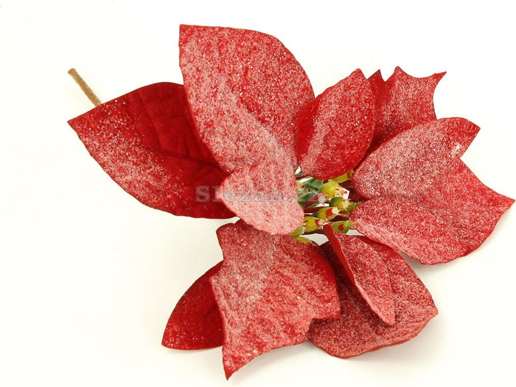 Květina umělá vazbová. Vánoční růže, poinsécie , barva červená zasněžená