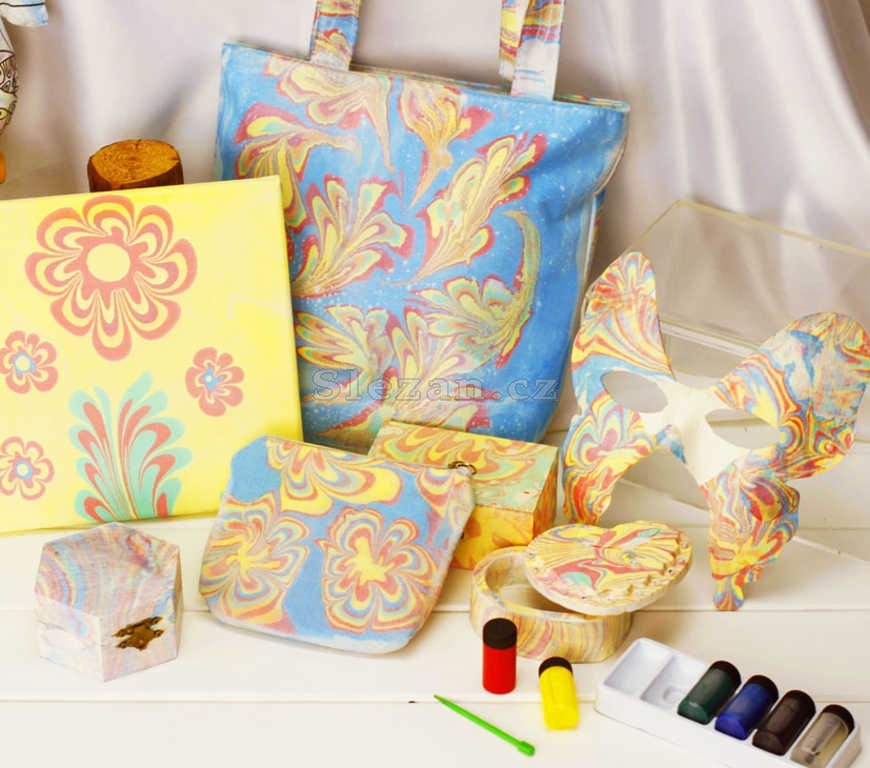 Mramorování je způsob malování pomocí barev, které se přenášejí z vodního povrchu. vhodné na papír, látku, dřevo. Nehodí se na plastové povrchy.