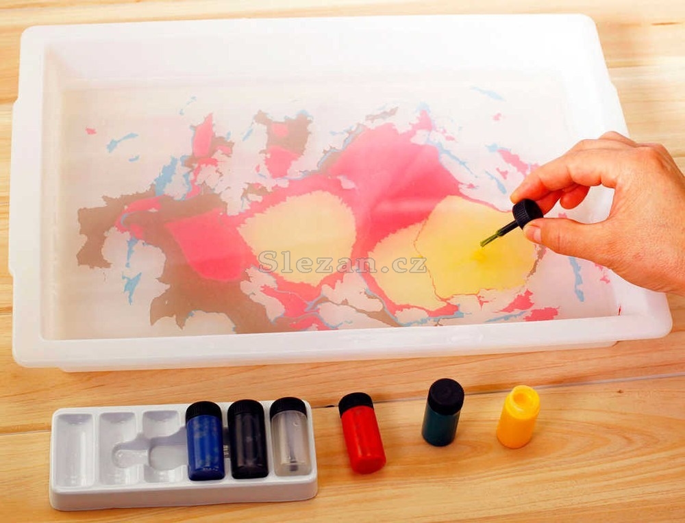 Postup: rozpusťe jedno balení prášku ve vodě. Přidejte několik kapek barev. Nakreslete vzor. Přiložte na hladinu vody požadovaný materiál k obtištění. Nechte zaschnout a obrázek je hotový.