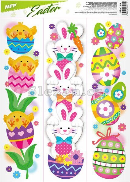 Okenní fólie bez lepidla - velikonoční kuřátka, vajíčka, zajíčci - Vyzdobte si okno těmito krásnými samolepkami na okno. Vytvoří Vám kouzelnou atmosféru domova. NÁVOD: Sloupněte obrázek z podložky a umístěte na čisté, případně navlhčené sklo stranou, která byla na podložce. Obrázek elektrostaticky přilne. Folie se snadno sloupne a dá se přemístit. Cena za 1 ks, dodáváme v mixu po 4 ks dle skladové zásoby.