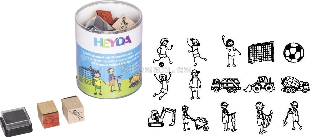 Razítkovací set v plastové dóze - fotbal a staveniště, s razítkovacím polštářkem
