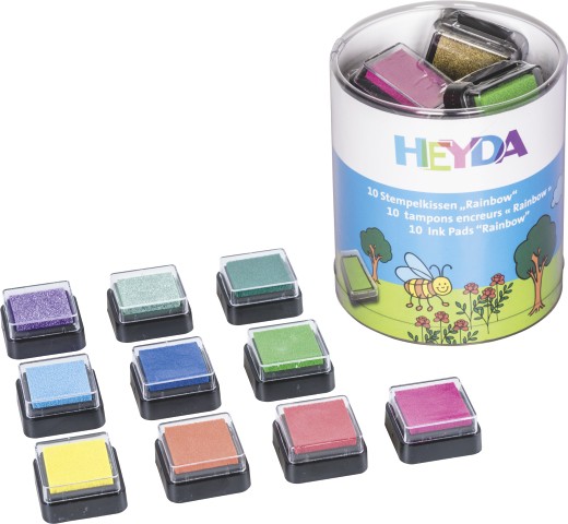 Razítkovací polštářky 10 ks - Duha, velikost polštářků 3x3 cm, nové barevné složení : žlutá, oranžová, červená, pink, fialová, světle modrá, tmavě modrá, tyrkys, světle zelená, tmavě zelená (tyrkys a fialová nahradila původní zlatou a stříbrnou)